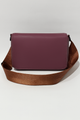 Handles: A single, wide, brown fabric or webbed shoulder strap.
